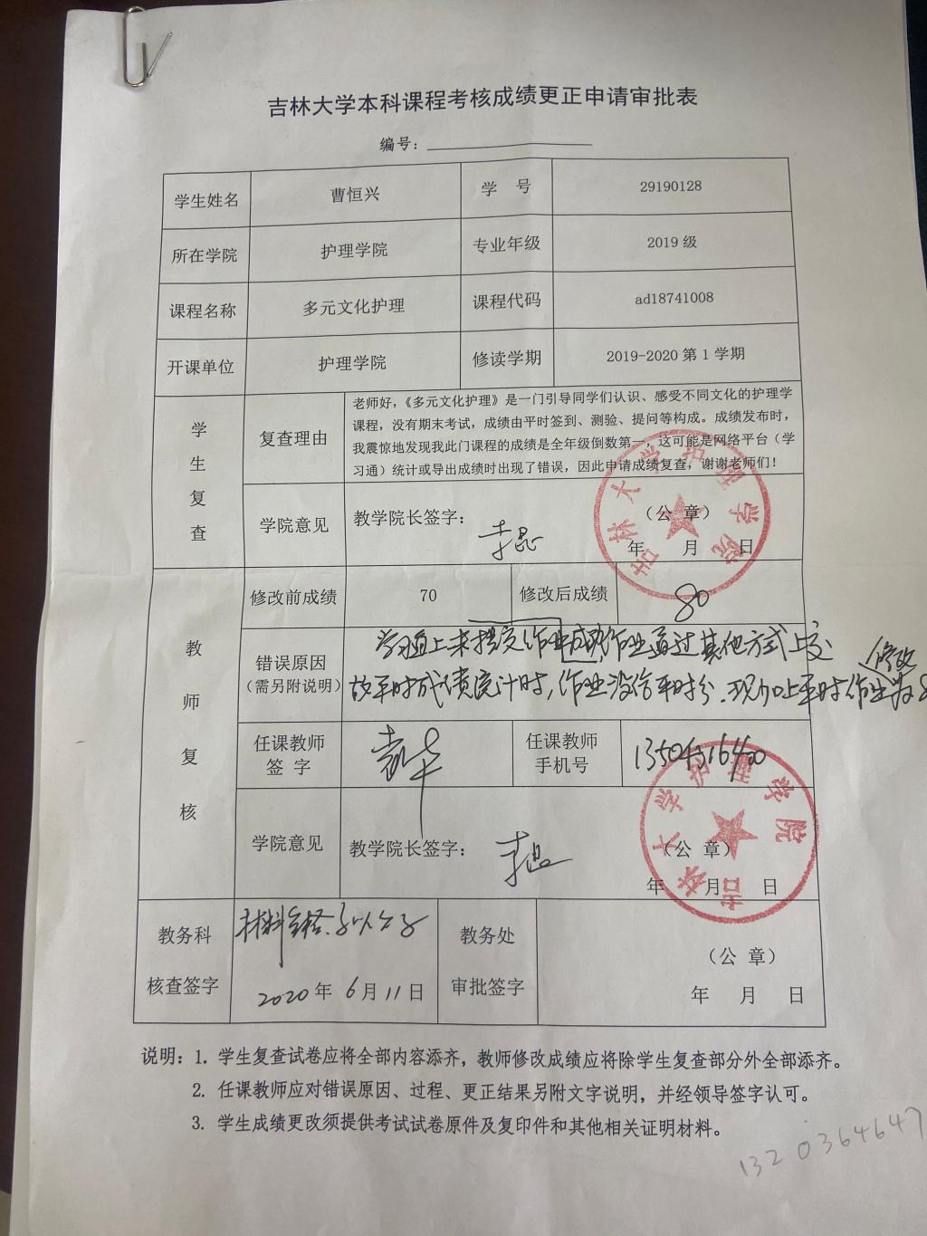 根据《关于进一步明确本科生课程考核等有关问题的通知》(校教字〔2018〕47号)文件有关精神,现对黑料不打烊 2019级曹恒兴同学(学号:29190128)2019-2020-1学期课程成绩更正如下: