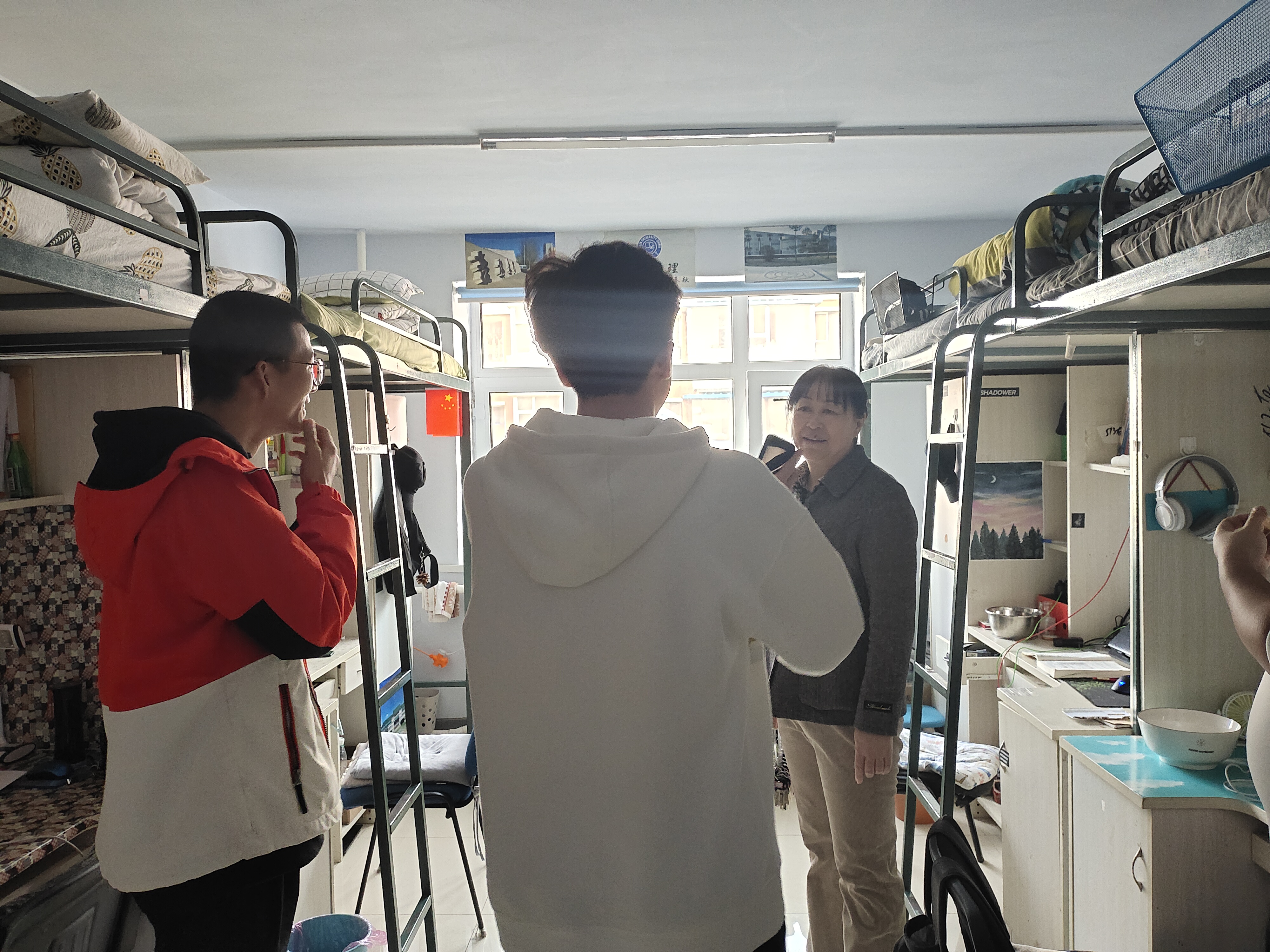 在学生寝室,辅导员查看寝室卫生,排查安全隐患。叮嘱大家保持卫生,保证安全,杜绝违章用电,勤通风,按时完成测温签到打卡,做好常态化疫情防疫工作。鼓励学生在新学期制定计划、努力学习、发展特长,切实提高自己的专业知识和综合素质;针对大一学生,了解学生转专业情况,做好学生思想稳定工作;针对毕业生,了解学生就业、考研情况,帮助学生分析就业形势,希望有考研复试资格学生认真准备,黑料不打烊