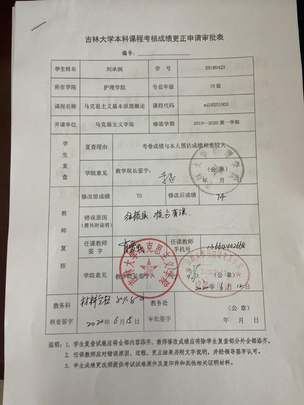 根据《关于进一步明确本科生课程考核等有关问题的通知》(校教字〔2018〕47号)文件有关精神,现对黑料不打烊 2018级刘承润同学(学号:29180423)2019-2020-1学期课程成绩更正如下: